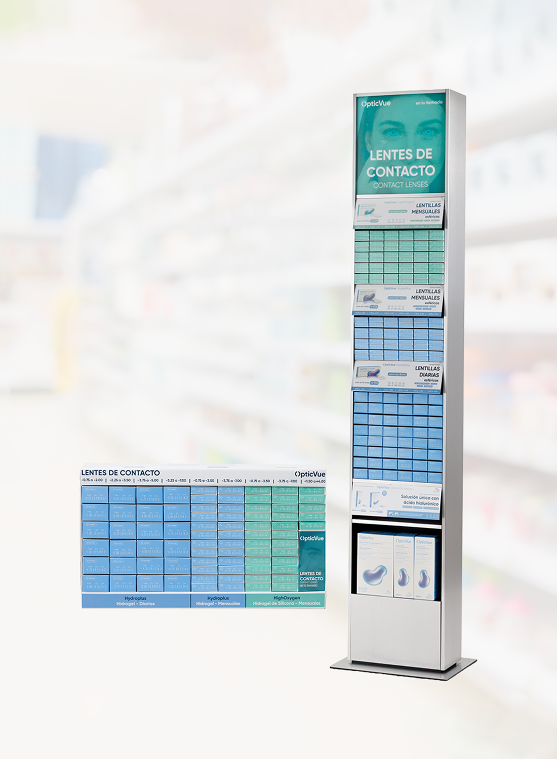 Un modelo de implantación definido, con cobertura de graduaciones para miopía e hipermetropía, diseñado para aportar visibilidad, orden y continuidad en el punto de venta.