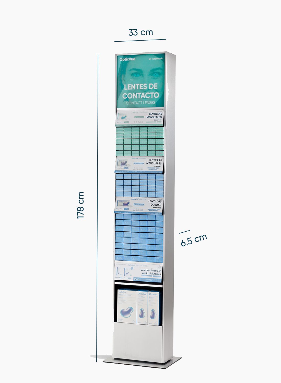 El expositor de pie está diseñado para maximizar la visibilidad de OpticVue y consolidar la categoría dentro del punto de venta. Su formato vertical crea un punto de impacto claro, ordena la gama por graduación y facilita la compra autónoma.