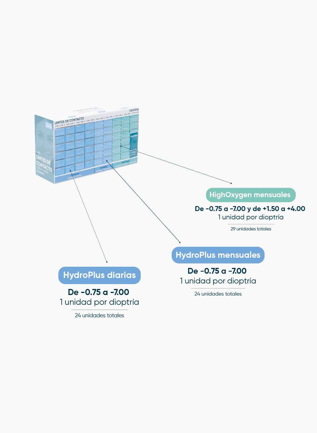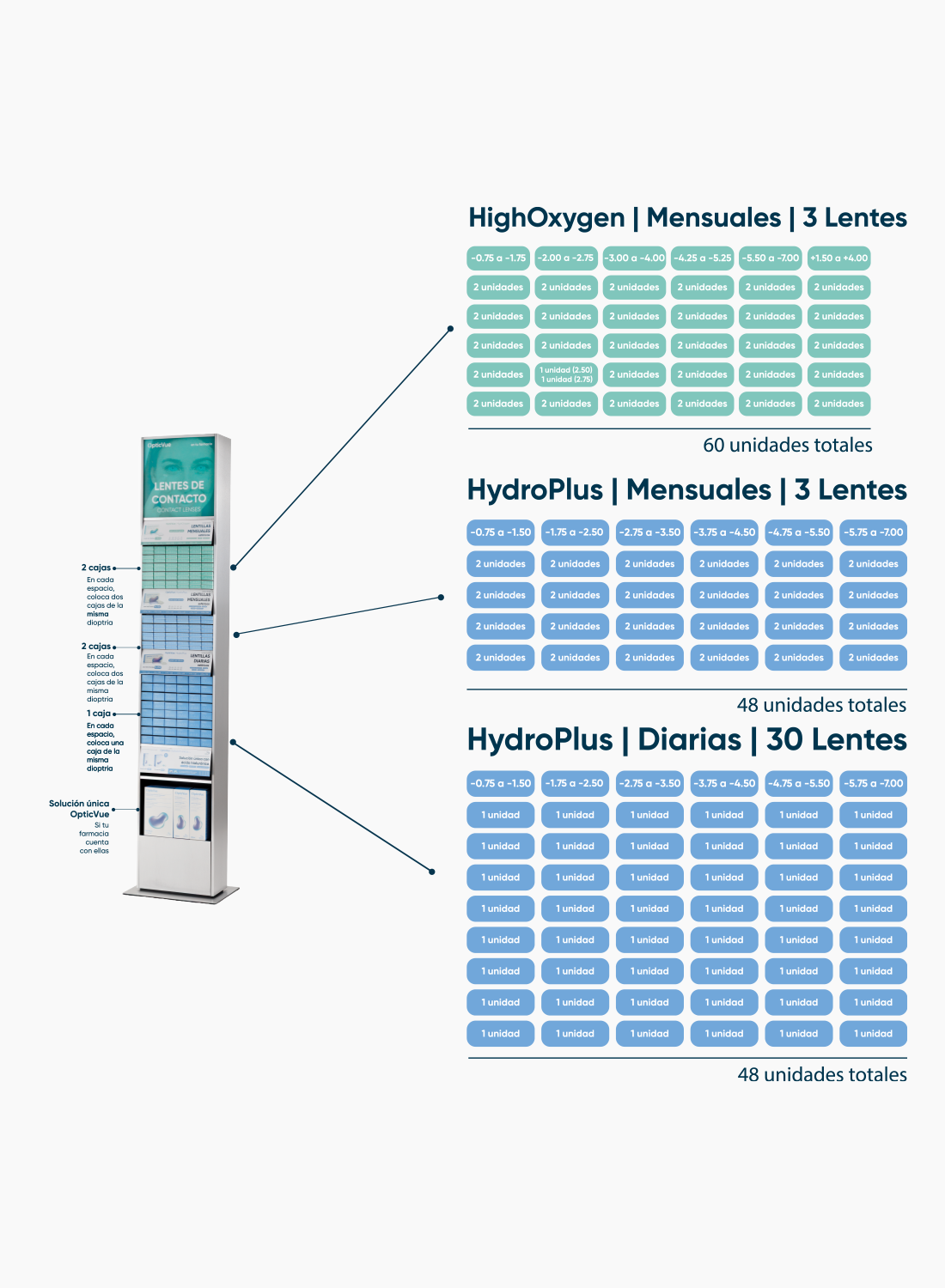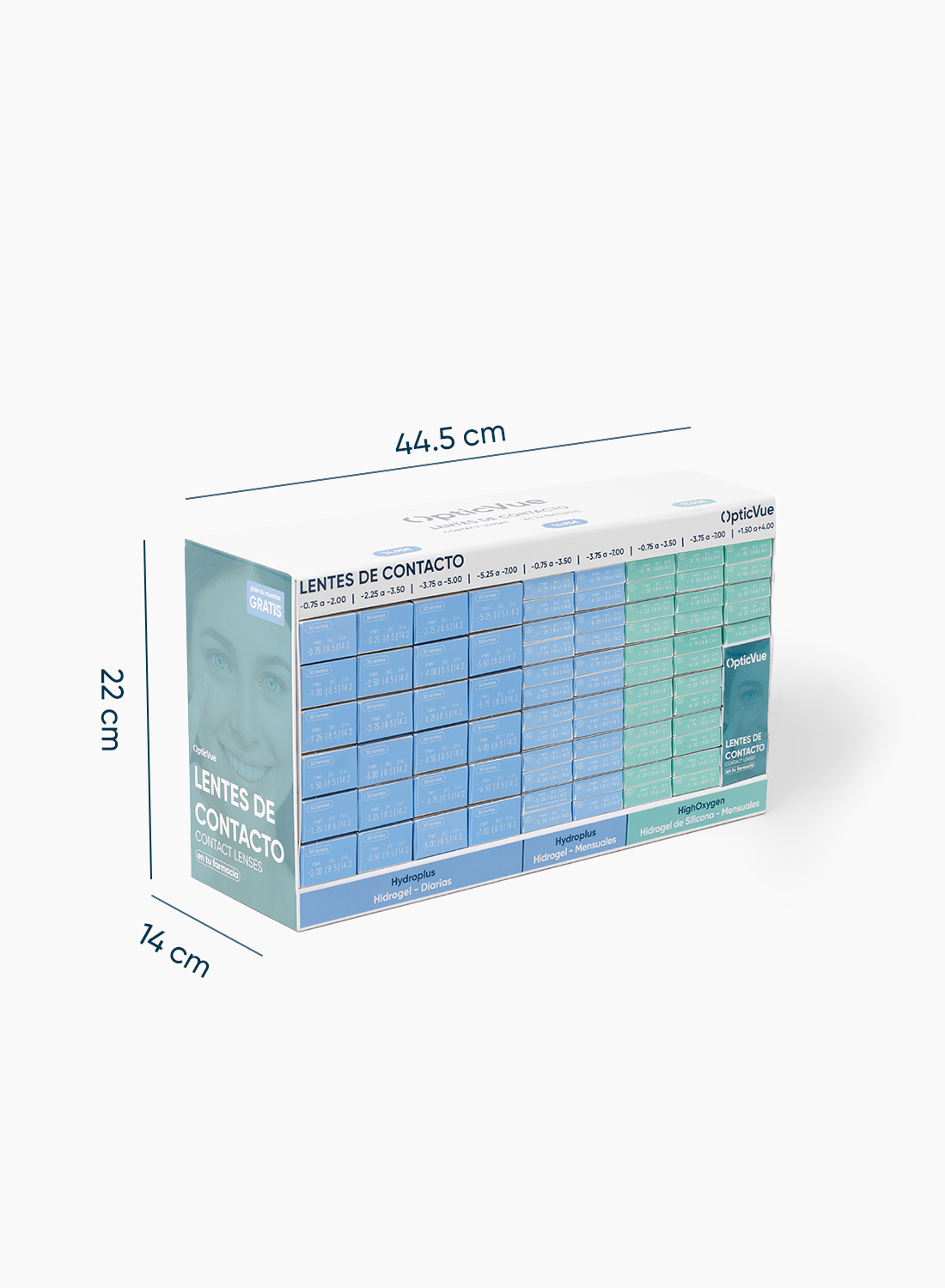 Incluye lentes de contacto mensuales y diarias con una amplitud de graduaciones de miopía (de -0.75 a -7.00) e hipermetropía (en gama HighOxygen de +1.50 a +4.00), organizadas por dioptría para mantener una organización clara dentro del mostrador.